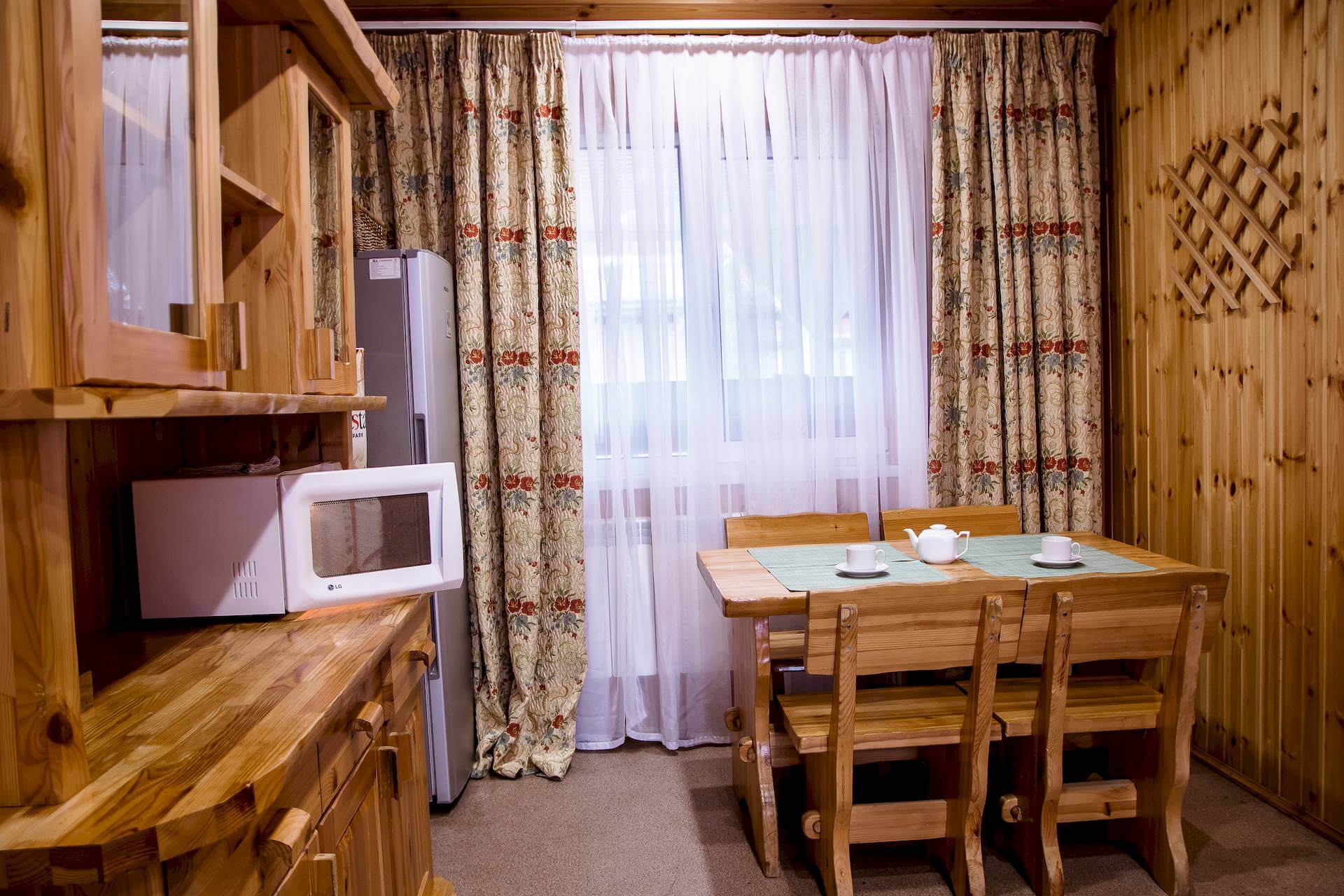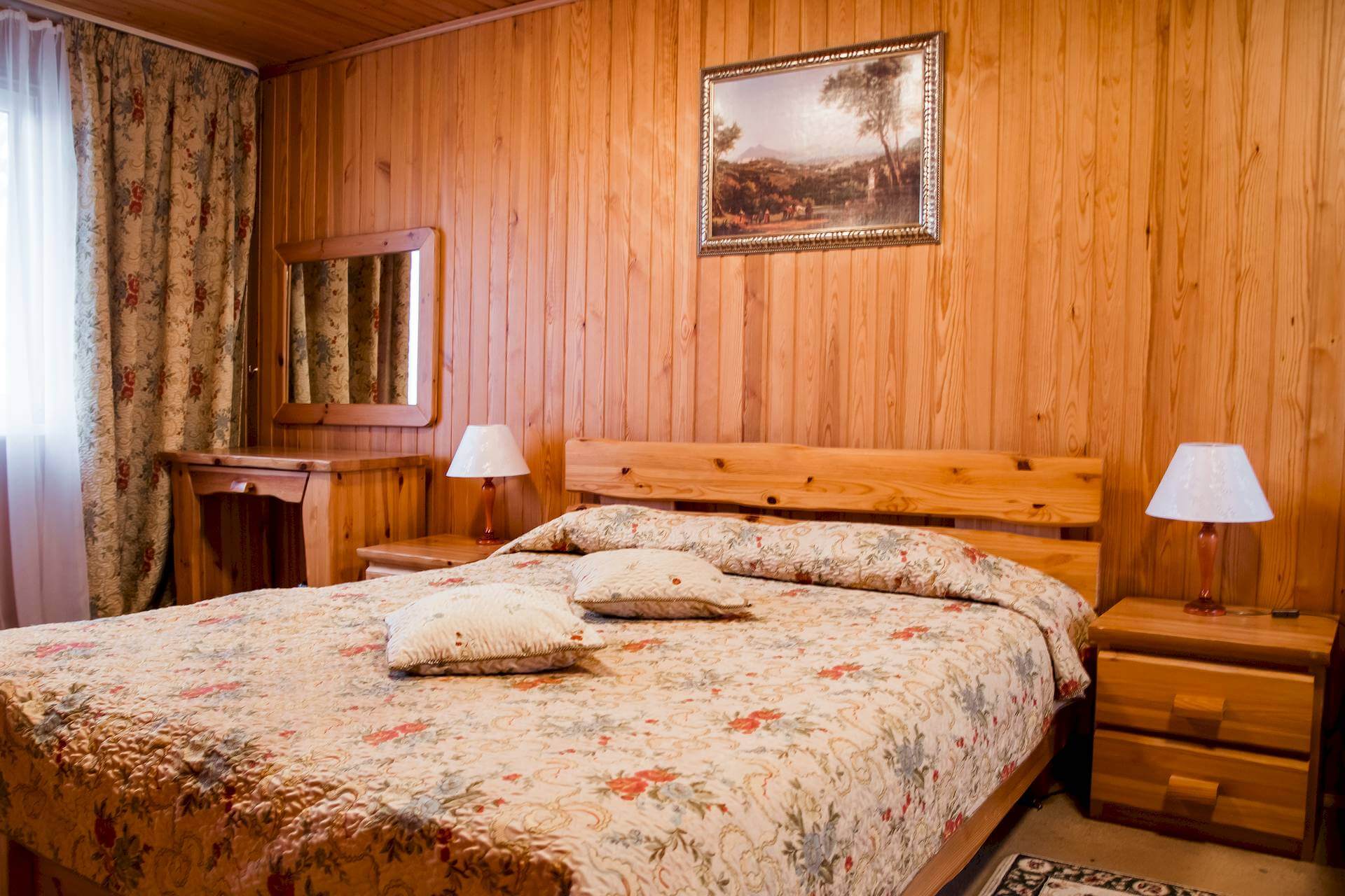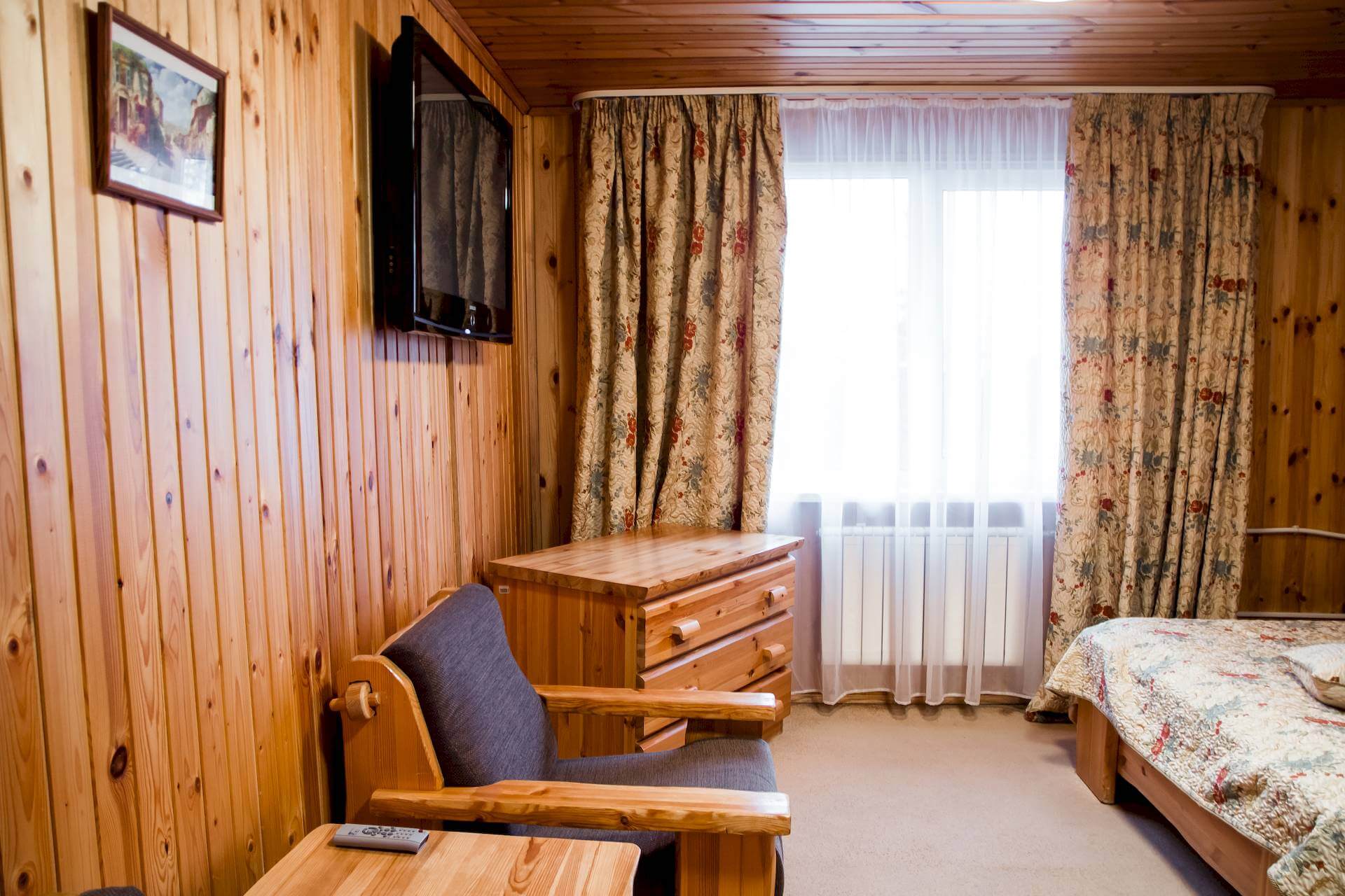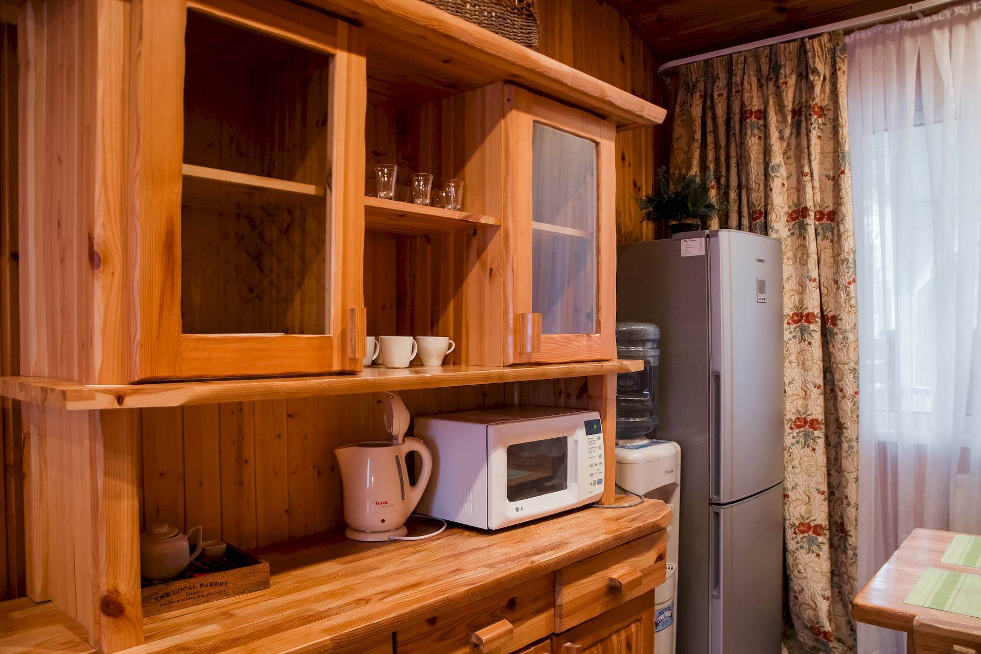 Одноэтажный двухкомнатный коттедж площадью 48 квадратных метров предлагает гостям автономное и уютное размещение в формате загородного домика. Спальная комната оборудована двуспальной кроватью, а гостиная зона — вместительным раскладным диваном, что позволяет комфортно разместить от двух до четырёх человек. Внутреннее пространство дополняют бытовые удобства: микроволновая печь, холодильник, электрический чайник и декоративный электрокамин, создающий атмосферу тепла и уединения. Такой формат проживания особенно востребован семьями и гостями, ценящими независимость, домашний уют и близость к природе при сохранении всех преимуществ инфраструктуры отельного комплекса.