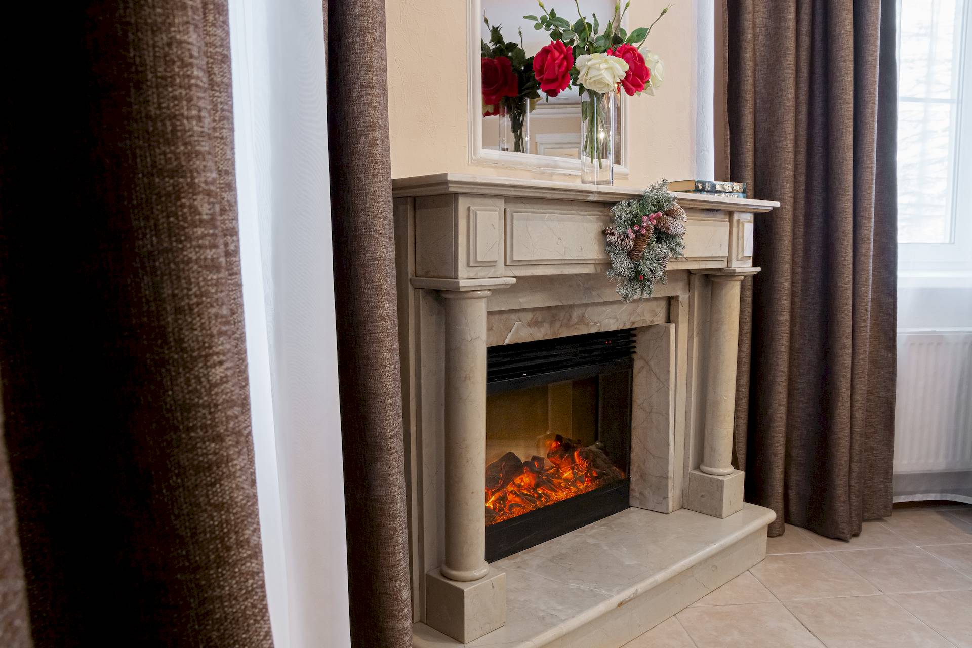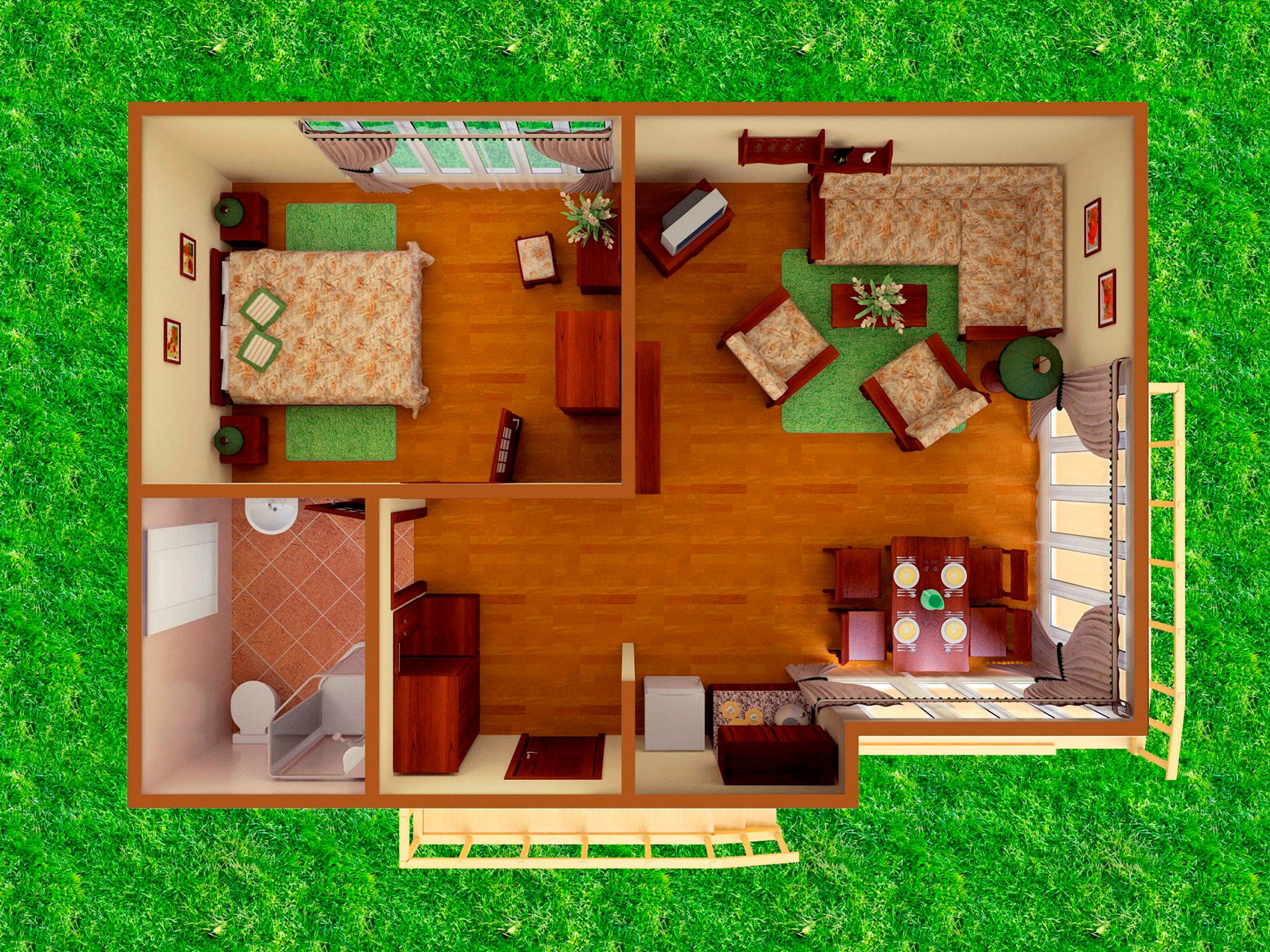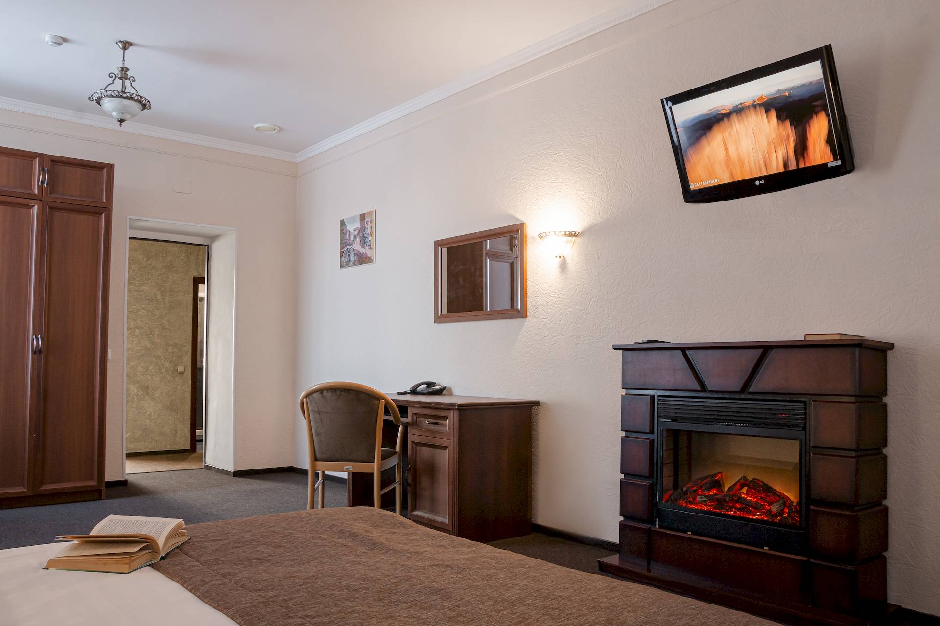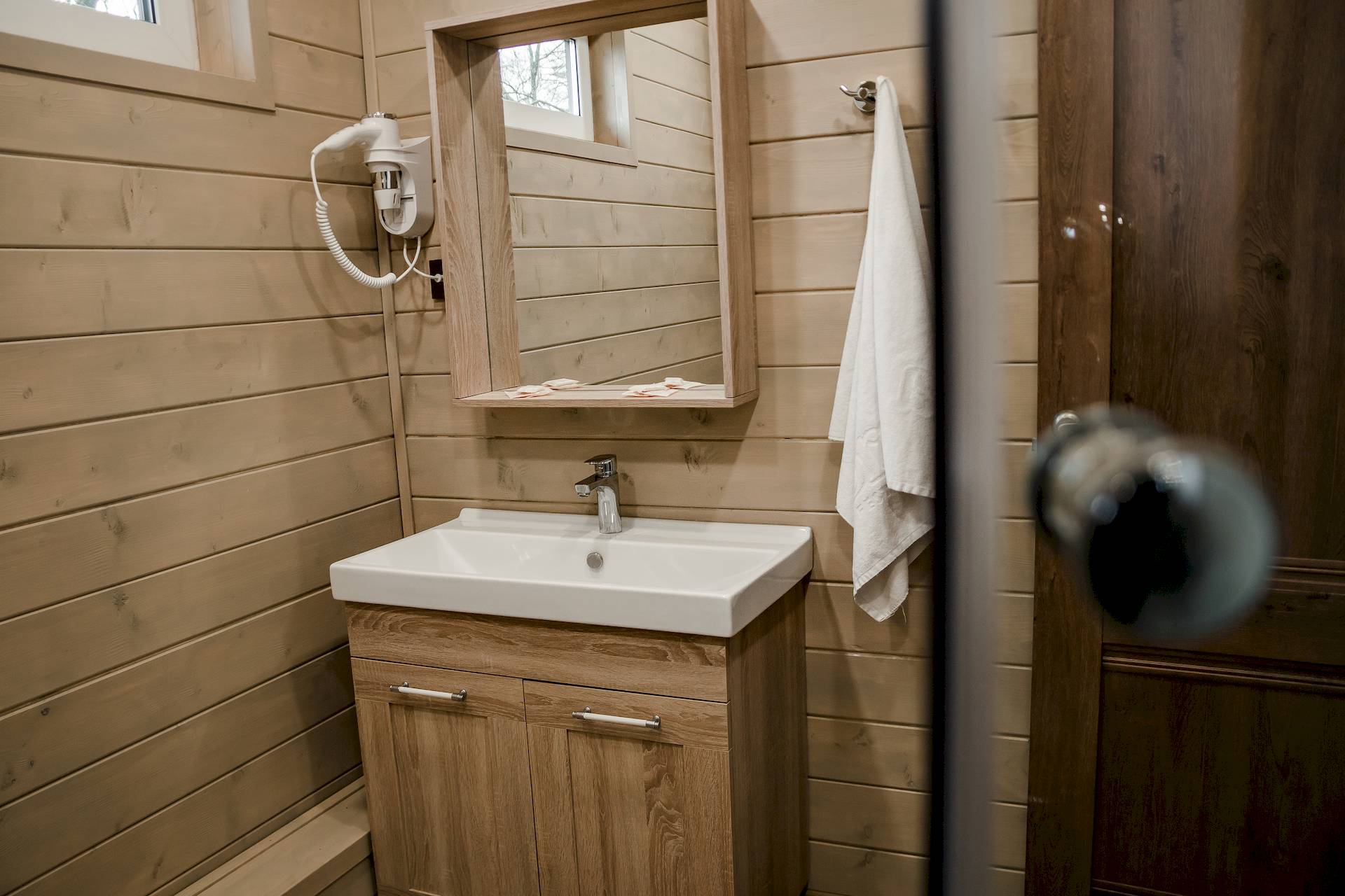 Одноэтажный двухкомнатный коттедж площадью 48 квадратных метров предлагает гостям автономное и уютное размещение в формате загородного домика. Спальная комната оборудована двуспальной кроватью, а гостиная зона — вместительным раскладным диваном, что позволяет комфортно разместить от двух до четырёх человек. Внутреннее пространство дополняют бытовые удобства: микроволновая печь, холодильник, электрический чайник и декоративный электрокамин, создающий атмосферу тепла и уединения. Такой формат проживания особенно востребован семьями и гостями, ценящими независимость, домашний уют и близость к природе при сохранении всех преимуществ инфраструктуры отельного комплекса.