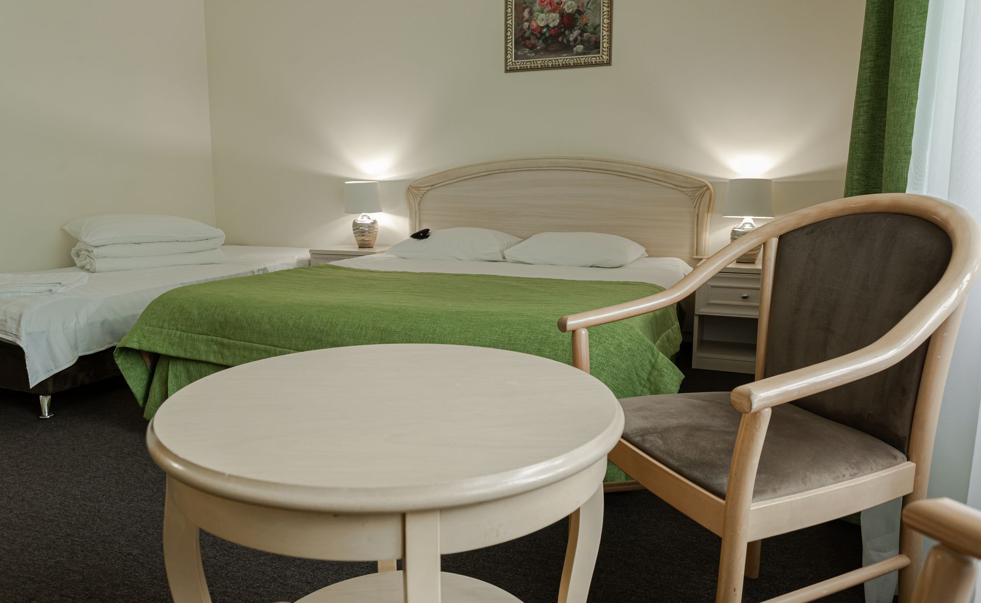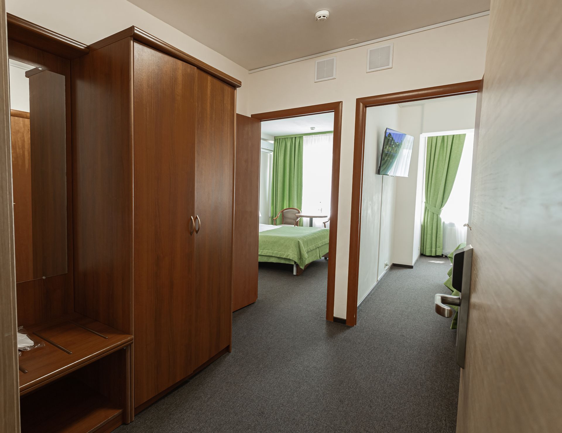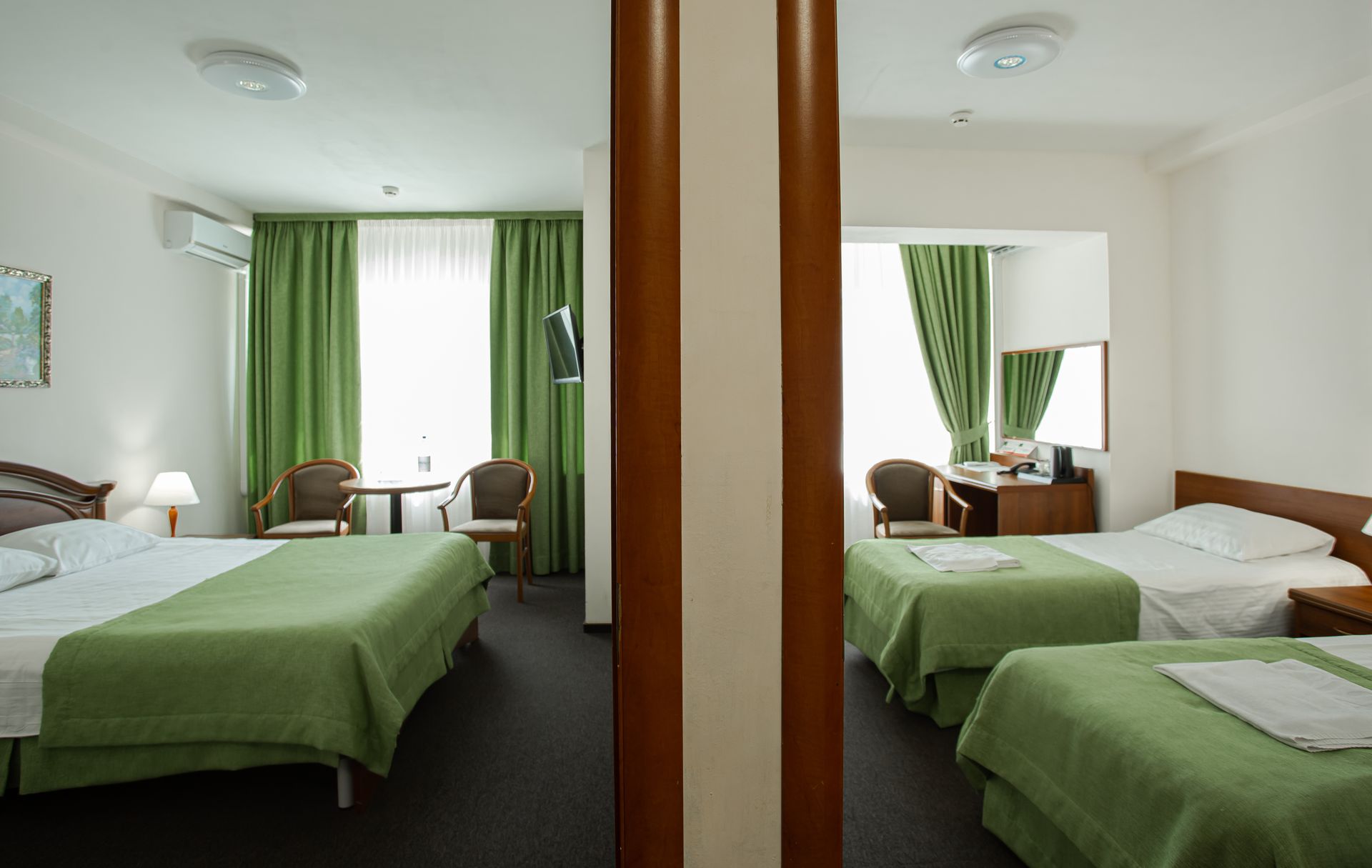 Двухкомнатный номер категории «Семейный» предлагает продуманную планировку общей площадью от 33 до 55 квадратных метров, идеально подходящую для совместного отдыха родителей с детьми или небольшой компании. В первой комнате размещена двуспальная кровать или две односпальные, во второй — вместительный раскладной диван, обеспечивающий комфортное спальное место для дополнительных гостей. В ряде номеров предусмотрена гостиная зона, что добавляет пространству функциональности и уюта. Такая компоновка позволяет разместить от двух до пяти человек, сохраняя личное пространство и обеспечивая удобство для всех членов семьи. Интерьер выдержан в современном стиле с акцентом на практичность, безопасность и эстетику, соответствующую запросам гостей, выбирающих качественный семейный отдых.